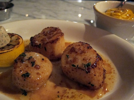 The mains here at Prima restaurant are almost all fish, all cooked simply and (we presume) well, and offered steak-house style with your choice of sauce. We tried the Sea Scallops, which were fat, sweet, perfectly done, and made even more special by the charred lemon and bonito butter on the side. So good, in fact, that we barely even touched our sauce choice, the tomato-y Vierge. (Next time: the Tempura Hake with Tartar Sauce… or maybe the Arctic Char with Bernaise? All of these, by the way, are under $20.) Continuing the steak-house structure, the entrees come side-less, but there’s a solid half-dozen or so from which to choose in the Vegetables department, all under $10. We went with the Squash Puree (a blend of Butternut and Kabocha, smooth and sweet) with brown butter, and it was dense and fantastic, though it left us zero room for dessert. Next time. Which there will most definitely be.