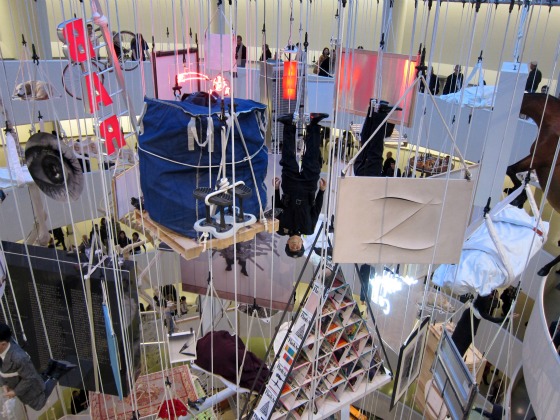 The gimmick here at the Guggenheim’s Maurizio Cattelan: All, as you can see from the pictures, is that every piece of art in the show is hanging from the museum’s ceiling. All of it, all 123 works, strung up to the struts just below the Guggenheim’s great oculus, and dangling down at varying heights. So as you walk up (or down) the Guggenheim’s signature spiral, instead of looking out, you look in: at the stuffed burro and the super-elongated foosball table; at the Pope felled by a meteor and John F. Kennedy in a coffin; at Cattelan’s many scupltural self-portraits, often engaged in childish behavior; at an elephant dressed as a ghost (or is it a Klansman?) and a huge-headed Picasso springing from a Lichtenstein. The result is dizzying, thrilling, magical.