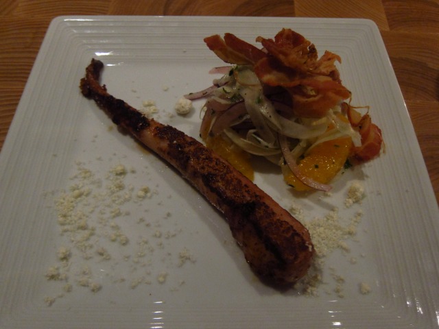 Take my octopus appetizer, for example, a single tentacle of perfectly-cooked (crispy skin, meltingly tender inside), well-seasoned cephalopod paired smartly with a cool, fennel-based slaw and a pile of thinly sliced pancetta adding some gamey crunch. Taramosalata, the classic, pinkish, fish-roe dip that is certainly the Greek dish I’ve eaten most often in my life, was a bit of a disappointment at Snack EOS: too soupy, oddly astringent. Better to head right for Kalamaki section of the Snack EOS preview menu, entree-sized skewers of meats and veggies all priced under $20. I had the lamb, which was maybe a bit overcooked, but nicely seasoned and plenty tender, arriving with chunks of soft, sweet squash and chewy farro salad.