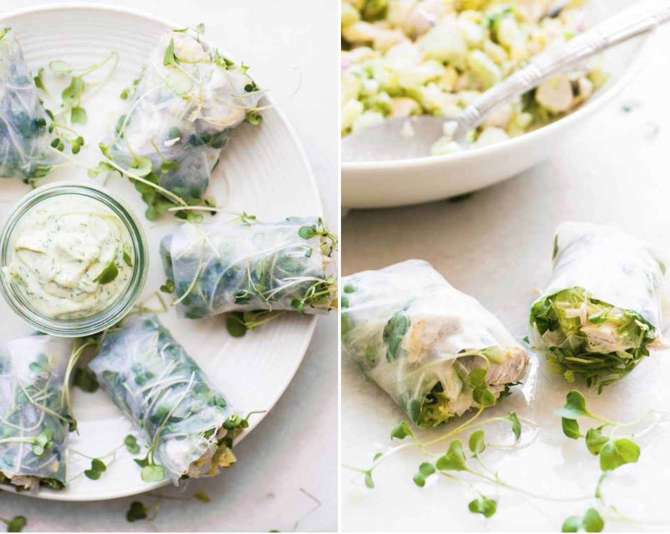- To assemble the rolls, put some cold water in the bottom of a pie plate or large shallow bowl. Working one at a time, dip a rice paper wrapper into the water for about 8-10 seconds, just until it starts to soften, and then put it on a smooth surface. A flat counter top works well, or any other smooth flat surface. Arrange a small bunch of micro-greens in the center of the paper, and top with about 1/4 cup of chicken salad, arranged in a line.