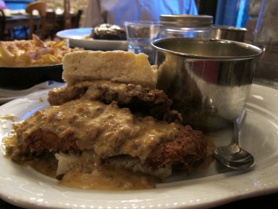 The Jacob's Pickles menu is all pretty appealing and, as we said, the portions are more than generous. Anyway, we started in the Jacob's Pickles "Jacob's Pickles" part of the menu and were treated to a pair of excellent Pickled Eggs, sliced in half and swimming with a bushel of peppers, both sweet and hot, in a kicky jalapeno brine. This was great, and made us want to try more–the Salt and Pepper Asparagus? The Sweet and Spicy Carrots?—next time. The Southern Biscuit Sandwich section was next, and though all of these sound good, we opted for the Sausage Gravy Smothered (Fried) Chicken, which was exploding with flavor, and set upon a huge buttermilk biscuit. Oh, and it also came with a tub a cheese grits.